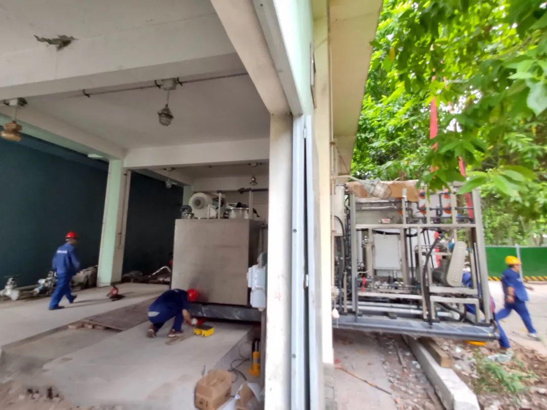 在安裝就位過程中,由于設(shè)備車間空間小,導致設(shè)備挪運難度大,整個過程異常艱難,但碩特環(huán)保忠縣項目人員始終堅持“迎難而上,堅持到底”的原則,發(fā)散思維,就地取材,最終在土建方及業(yè)主的大力配合下,順利完成了就位工作。