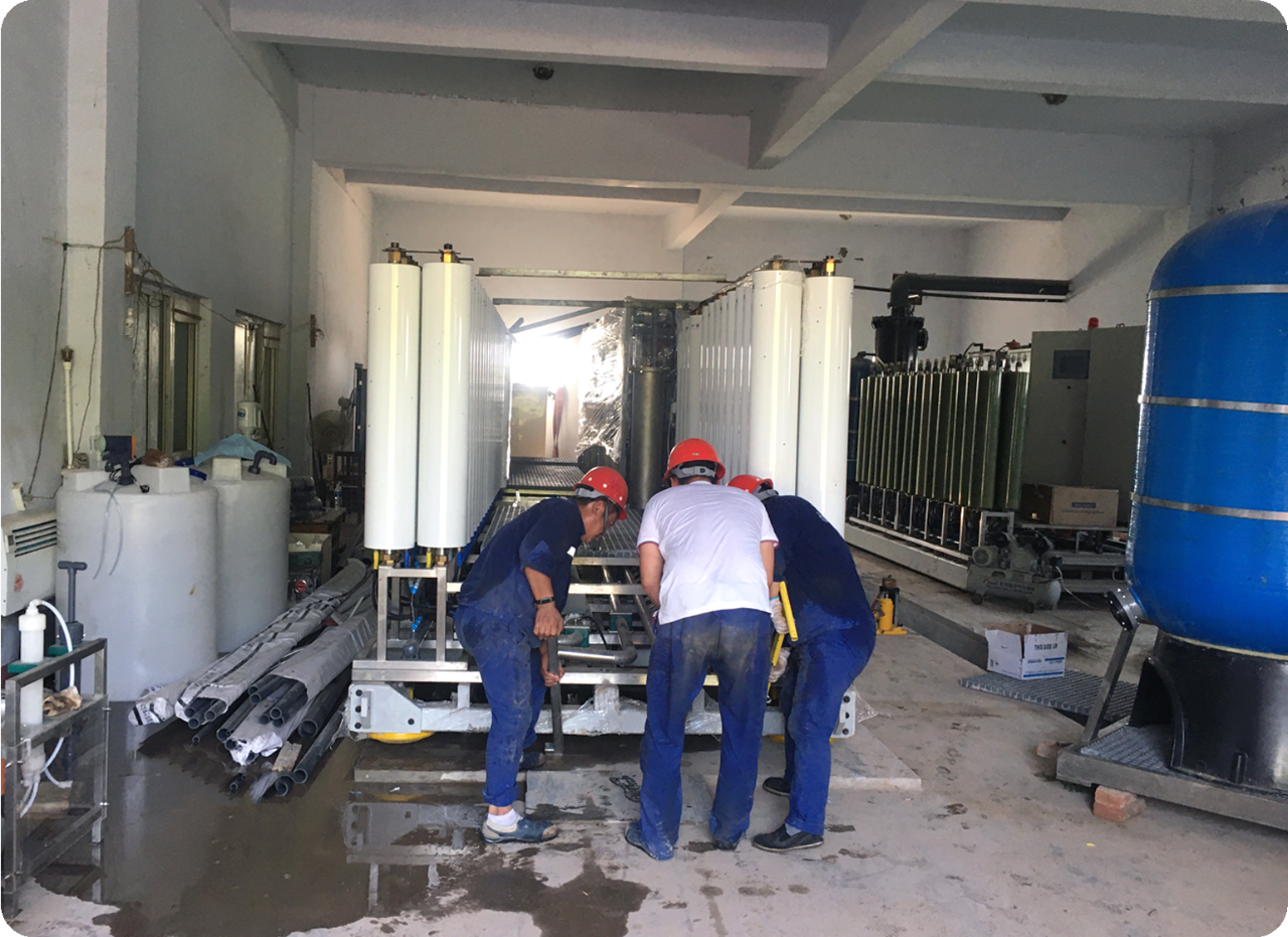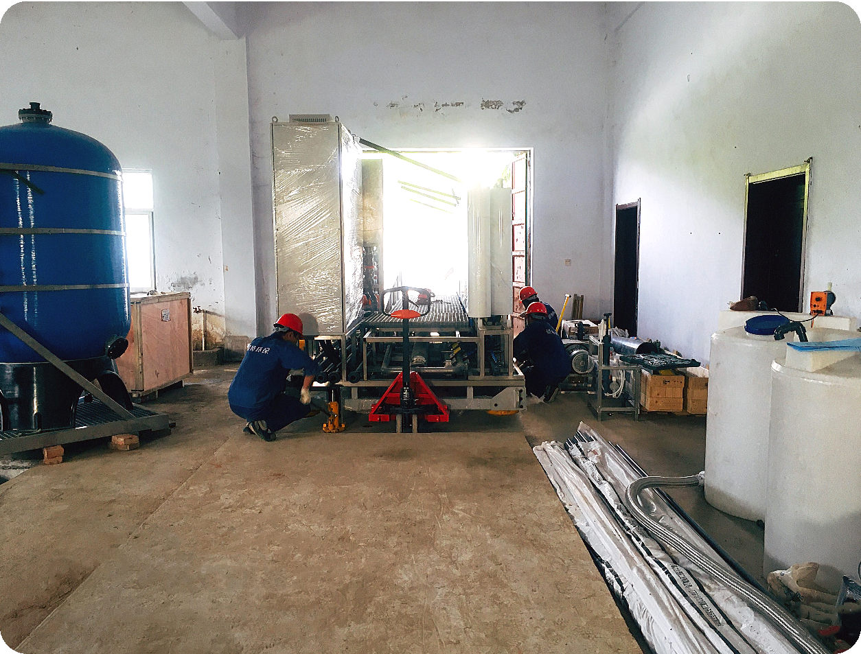 在項目負責人的帶領(lǐng)下,項目部施工員們緊張有序地開展著后續(xù)各項工作。在設備安裝過程中因業(yè)主膜車間空間受限,設備只能從膜車間門口用專業(yè)搬運器具一點點將設備安裝到已制作好的設備基礎上。搬運過程中項目部施工員們不怕苦、不怕累,在組長的帶領(lǐng)下安全、有效地完成設備就位工作,充分體現(xiàn)出現(xiàn)場施工員們對解決困難問題的積極態(tài)度和對工作的高度專業(yè)性。