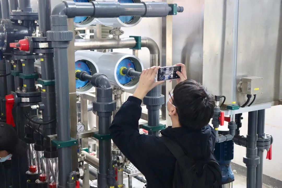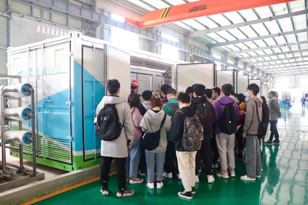 期間,副廠長陳虎和車間主任伍文帶領(lǐng)學生參觀工廠,了解公司情況,給學生詳細介紹公司設備、技術(shù)及設備工作原理。而后學生們隨車到達仁壽濃縮液全量處理項目現(xiàn)場,仁壽項目采用碩特環(huán)保自主研發(fā)的滲濾液濃縮液非蒸發(fā)全量處理工藝,運維負責人帶領(lǐng)學生們參觀感受整個項目的全流程處理工藝,讓學生們對廢水處理工藝及處理設備有更全面了解。