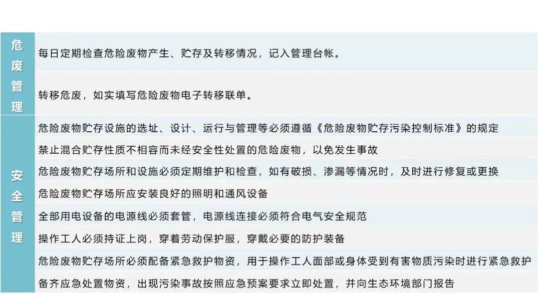 企業(yè)應(yīng)建立危險(xiǎn)廢物管理制度,明確危險(xiǎn)廢物管理的部門與責(zé)任人。明確危險(xiǎn)廢物處置的目標(biāo)指標(biāo),建立危險(xiǎn)廢物來源清單和危險(xiǎn)廢物處置商及處置情況清單。企業(yè)應(yīng)制定危險(xiǎn)廢物收集、貯存現(xiàn)場防滲、防泄漏、防雨等措施并規(guī)范實(shí)施,處置應(yīng)選擇有資質(zhì)單位并進(jìn)行危險(xiǎn)廢物轉(zhuǎn)移計(jì)劃備案,備案通過后,如實(shí)填寫“危險(xiǎn)廢物轉(zhuǎn)移聯(lián)單”并存檔。